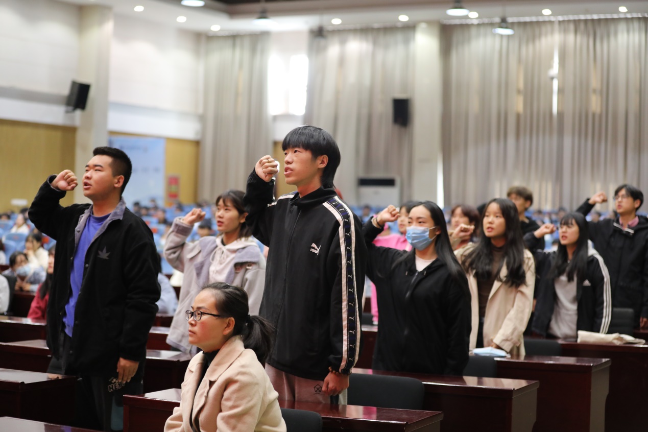 接下来19级班团干部代表在赵市委同学的带领下宣誓。新生报到期间19级班团干部、新生助理和志愿者汗流浃背每天工作十几个个小时,为2020级新生提供无微不至的服务。