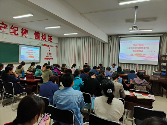 5月11日下午,环境工程学院在SY5405会议室召开习近平同志《论党的宣传思想工作》专题学习会,会议由党总支书记王国英主持,副院长王振伟领学,全体教职工参加了此次专题学习。