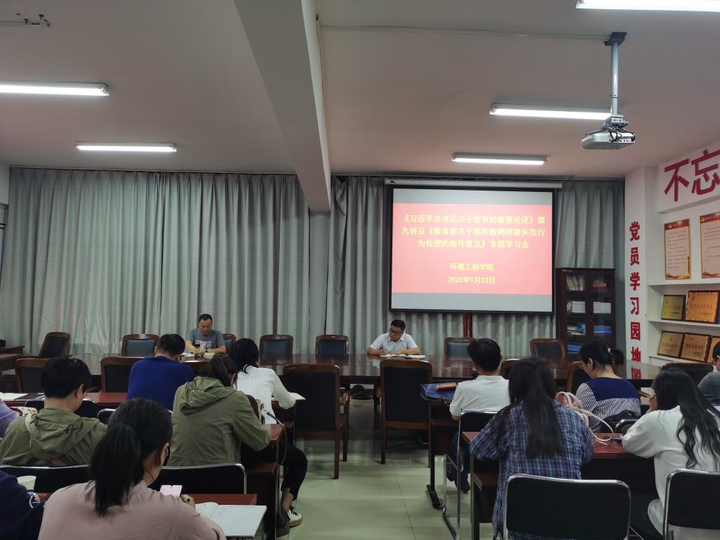 9月22日下午,环境工程学院党总支组织全体教师集中学习《习近平总书记关于教育的重要论述》第九讲及《教育部关于高校教师师德失范行为处理的指导意见》,会议由副院长(教工支部书记)王振伟主持,全体教师参加了此次专题学习会。