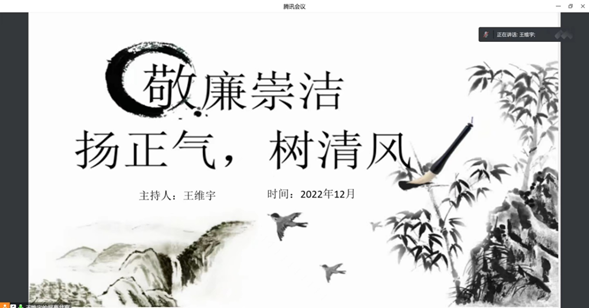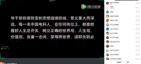 环境工程学院2022级辅导员王维宇组织学生干部在腾讯会议线上观看廉洁教育微电影“罪之路”。通过影片学习,同学们进一步加强了对党风廉政建设和政治学习必要性的深刻认识,同时也明白自己作为学生干部所承担的责任,不但要以身作则,严守校规校纪,更要带领全班同学正确认识腐败与廉洁、自觉抵御大学腐败亚文化,营造公平正义的良好班风。