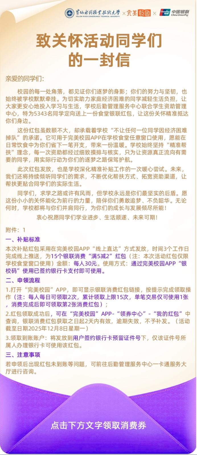 寒冬送暖,情系学子。为切实落实精准帮扶举措,彰显对校园家庭经济困难群体的关怀与敬意,近日,后勤管理服务中心党总支饮食信管支部联合学生资助管理中心,自11月14日-12月8日,开展食堂消费红包关怀活动。活动依托完美校园APP平台,向在校5343名家庭经济困难大学生定向发放食堂银联消费红包,发放总额达16万余元消费红包,以实打实的“真金白银”的硬核举措传递校园温情,厚植人文关怀底色。