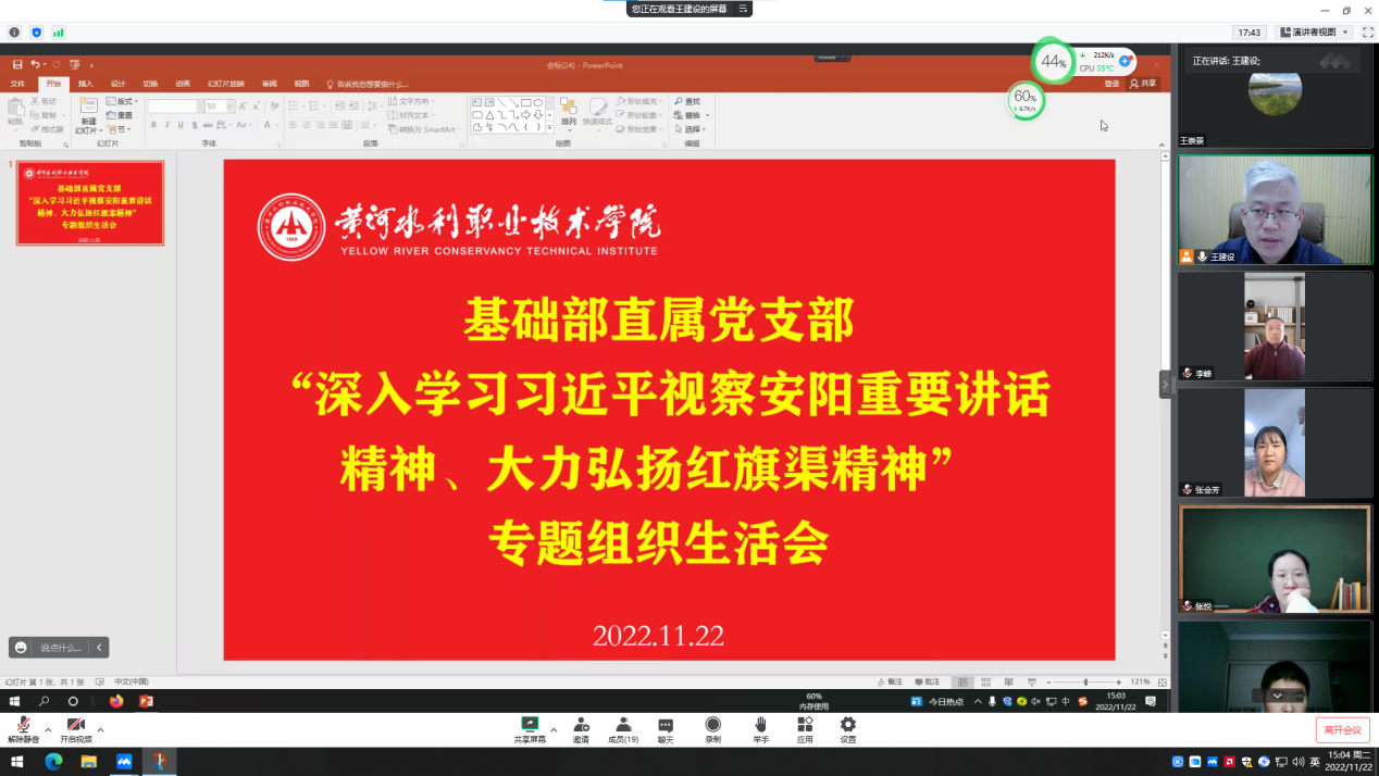 11月22日下午,基础部直属党支部召开线上会议,深入学习贯彻党的二十大精神和习近平总书记视察安阳重要讲话精神。会议由直属党支部书记王建设主持,基础部全体党员参加会议。