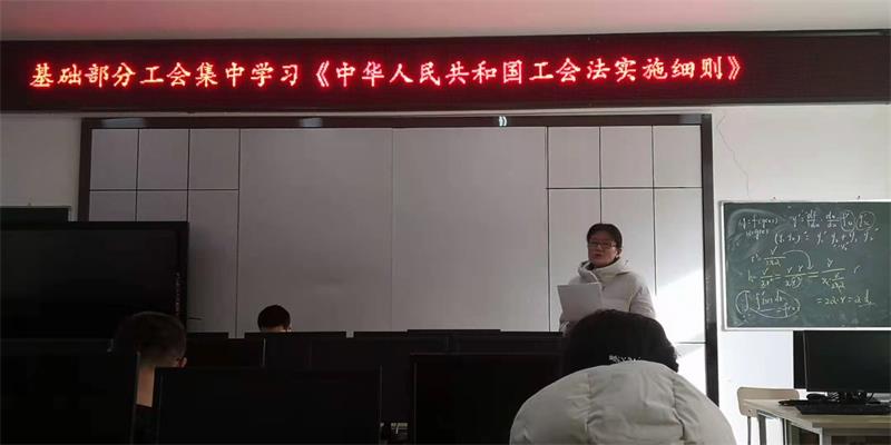 12月15日下午,基础部在SY5522组织全体教师集中学习《中华人民共和国工会法实施细则》(以下简称《细则》),《工会基层组织选举工作条例》(以下简称《条例》)等。会议由主任吕振雷主持,部全体教师参加学习。
