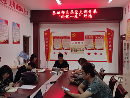 5月25日下午,基础部直属党支部在党员活动室开展2021年“两优一先”评选活动会。活动会由基础部直属党支部书记吕振雷主持,全体党员参加。