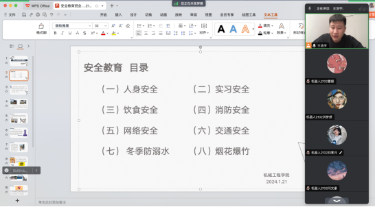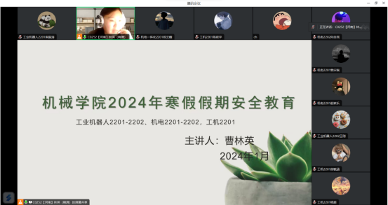 为落实学校安全工作会议精神和部署要求,切实增强学生安全意识,提高学生自护能力,确保全体学生度过一个安全、文明、健康、和谐、愉快的假期,1月21日至22日机械工程学院全体辅导员利用线上会议组织召开2024年寒假学生安全教育主题班会。
