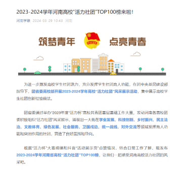 3月29日,共青团河南省委公布2023-2024学年高校“活力社团”风采展示活动评选结果,机械工程学院机械兵团创业者协会学生社团入选河南省高校“活力社团”TOP100榜。