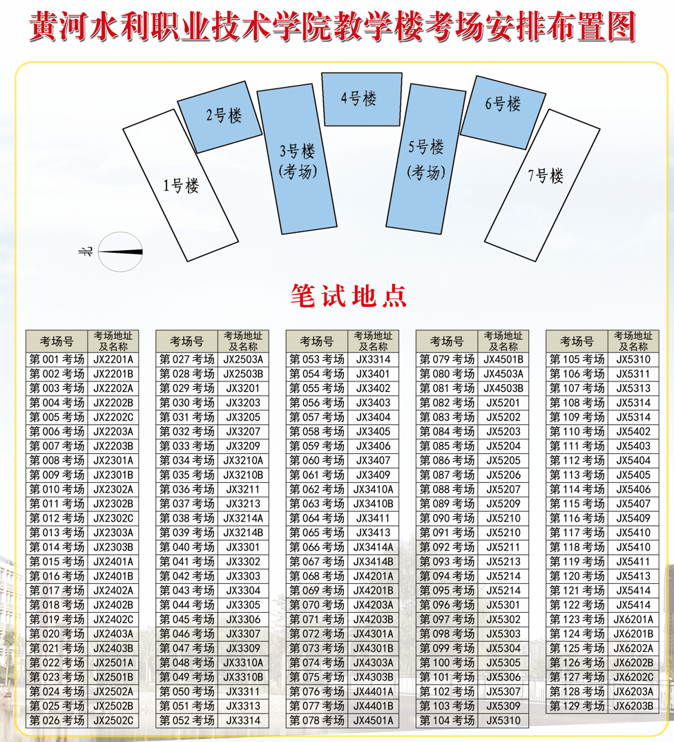 3.考场教室名称例如JX5301指的是5号教学楼3楼01房间,对于JX2201A、JX2201B等考场名称加字母(A、B、C)的含义为同一场考试的不同场次,其考试地点均为JX2201。