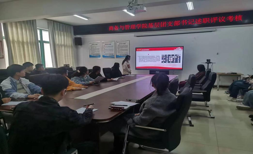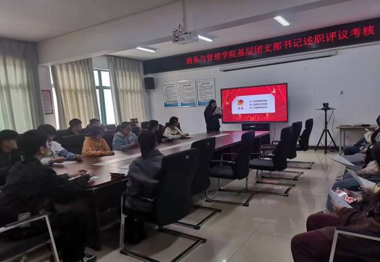 2023年2月28日下午,商务与管理学院团支部书记述职报告大会于5420会议室召开,分团委负责人肖星野、大一大二大三全体团支部书记参加会议、以及各级辅导员对各团支书进行考核。
