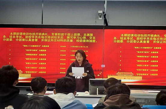 肖星野老师向同学们介绍了本次团课的学习安排及相关要求,并强调了团课培训的重要性和必要性。学员代表电子商务2301班杜晗哲同学作表态发言,她表示将用实际行动践行共青团员标准,在学习上做标兵,在生活中做表率,以更高的标准严格要求自己,为早日成为一名合格的共产党员而时刻准备着。