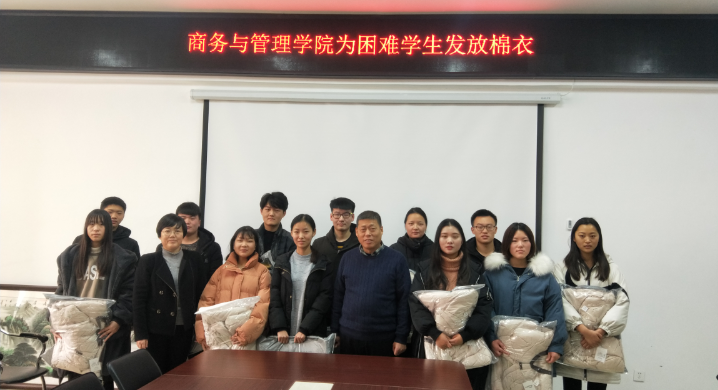 商管院书记樊建科、院长周爱荣和资助老师段然为困难学生发放棉衣棉被,接过衣服,很多同学迫不及待地试穿起来,同学们都非常兴奋,对衣服的款式、颜色、尺寸都表示非常满意。樊书记和周院长分别讲话,并询问他们的学习和生活情况,详细了解学生的需求,鼓励他们要不畏困难,自立自强,珍惜在校时光,勤奋学习,求真学问,练真本领,用知识改变命运,用奋斗成就未来。