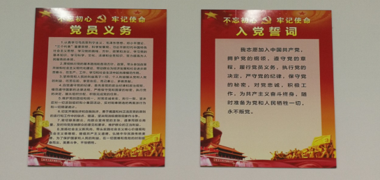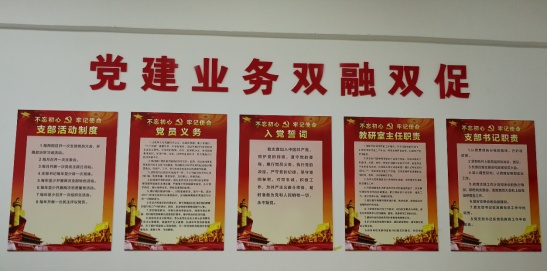 在“双带头人”工作室设置了支部书记职责、教研室主任职责、入党誓词、党员义务、支部活动制度等5个标牌,购置了一个党建专柜,在施工、管理教研室及实训中心办公室分别设置了入党誓词和党员义务2个标牌。此举意在打造党员教师的“思想空间站、动能加油站、身心疏导站”,改善支部办公条件,营造支部党建氛围,建设党员活动阵地,突出党建和业务双融合、双促进,展现党员教师新形象。