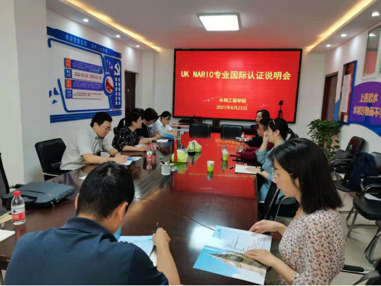 2021年6月23日,水利工程学院专业国际认证说明会在sy5312召开,纳里克国际教育科技(北京)有限公司总裁兼中心中方理事会秘书长焦满生、英国国家学历学位评估认证中心(UK NARIC)(以下简称“中心”)中国首席代表李华杰,学院院长陶永霞、水利水电建筑工程专业负责人李梅华、水电站动力设备与管理专业负责人职保平及相关骨干教师参会。会上,李华杰女士介绍了中心成立的背景,及通过专业国际评估认证后所能达到的成效与意义,并对评估认证流程做了详细讲解。