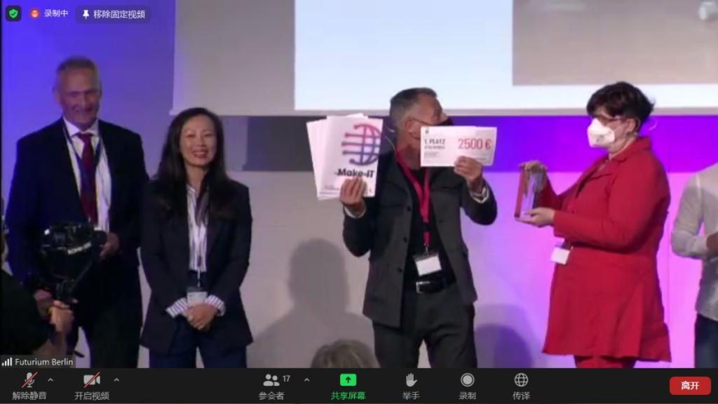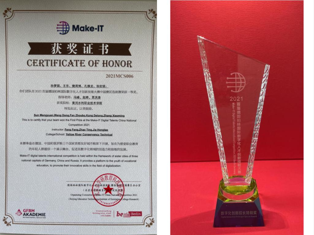 北京时间9月7日下午3点,2021首届德国柏林国际数字化人才创新技能大赛(简称Make-IT大赛)颁奖典礼在柏林、北京和莫斯科三地通过网络视频的形式共同举办。校长胡昊、创新创业学院副院长范龙、水利工程学院指导教师团队冯峰、赵婷、贾洪涛,参赛学生团队孙梦园、王东、石天乐、孔德龙、张校铭等在学校演播厅共同参加了颁奖典礼网络直播。