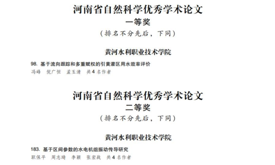 根据《河南省人力资源和社会保障厅 河南省科学技术协会关于表彰河南省第五届自然科学学术奖的决定》(豫人社发〔 2021〕37号)文件,经组织申报、单位初评和提名推荐、资格审查、评委会线上阅评和线下会评等程序,共评出河南省第五届自然科学学术奖 890 项,一等奖共239 项,二等奖共301 项,三等奖共350 项。365官网水利工程学院冯峰教授学术论文《基于流向跟踪和多重赋权的引黄灌区用水效率评价》获一等奖,职保平博士学术论文《基于区间参数的水电机组振动传导研究》获二等奖。