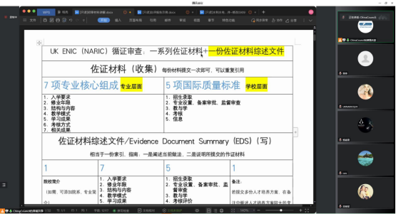 随后,UK ENIC中国办公室两位专家对参会的校方人员进行评估认证准备工作的培训,拟定了本次专业评估认证的时间表与关键步骤,详细介绍了UK ENIC评估认证流程、自评文件(EDS)撰写框架和佐证材料的内容及要求。