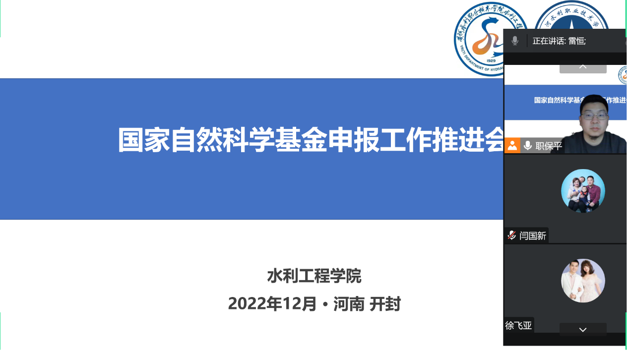 12月26日下午,水利工程学院在线上组织召开2023年度国家自然科学基金申报工作推进会,水利工程学院院长雷恒、副院长职保平以及水利工程学院全体博士参加会议,会议由职保平主持。