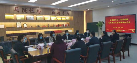 10月19日下午,党委副书记、校长胡昊深入马克思主义学院调研指导工作,并召开现场办公会议,研究解决存在的困难和问题。副校长焦爱萍出席会议,党政办、教务处、发规处、计财处、国资处、双高办等部门负责人与会。马克思主义学院院长兼直属党支部书记焦红强、副院长白霞和教师代表参加会议。