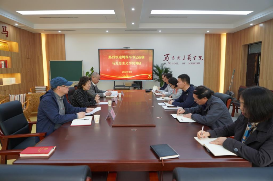根据习近平总书记关于在全党大兴调查研究之风有关讲话精神,4月11日上午,党委书记周保平随机听取了《习近平新时代中国特色社会主义思想概论》课,并深入马克思主义学院开展调查研究,与思政课教师亲切座谈。校党委副书记、工会主席杨士恒,党委宣传部部长彭新立一同参加调研。