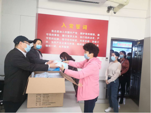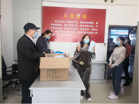 为了最大限度的降低人员聚集程度,以保障支部教师的生命安全和身体健康,支部采取分时段的方式依次为马列、德育、形势与政策三个教研室的教师进行防疫物资的发放。院党支部书记彭新立、副书记白霞亲自为教师们发放了防疫物资。