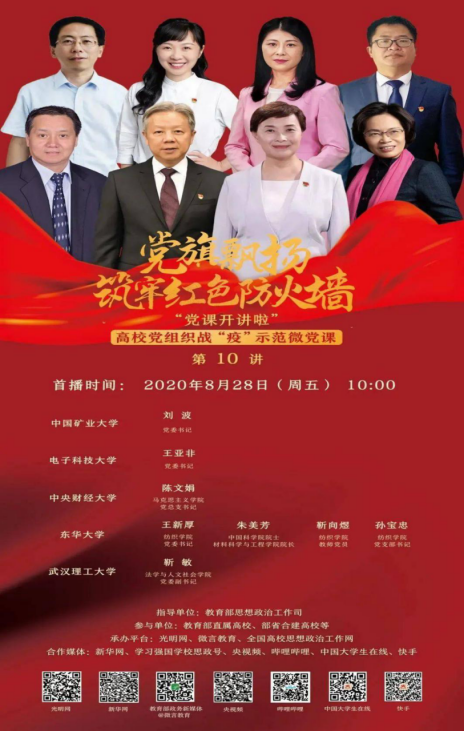 高校党组织战“疫”示范微党课经教育部党组批准,是各高校在突如其来的新冠肺炎疫情的背景下,讲述抗疫故事、传播抗疫精神、激发责任担当的优秀党课,旨在充分高校各级党组织的战斗堡垒作用和党员的先锋模范作用,让党旗始终高高飘扬在疫情防控、返校复学、事业发展的全过程全方位。本次微党课由中国矿业大学、电子科技大学、中央财经大学、东华大学、武汉理工大学五所高校联合开讲,主要分享了高校师生在疫情防控、教学实践、脱贫攻坚一线的感人故事为主题,突显着奉献者们践行着“坚决听党话,自觉跟党走”的初心和使命。