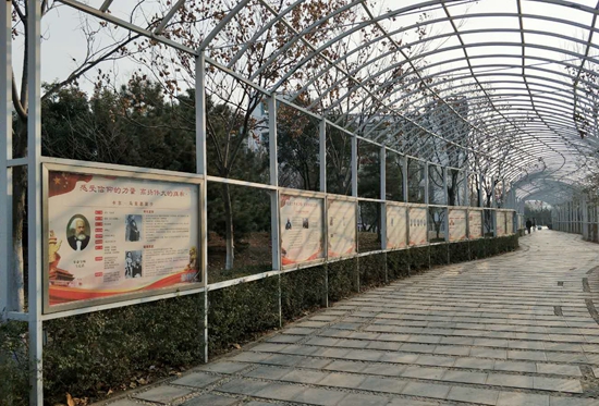 “青马小路”文化长廊位于1号教学楼北侧,是学生上下课、外出的主要通道。文化长廊主要以马克思主义思想,习近平总书记重要讲话论述,党的十九大和团的十八大精神,对社会主义核心价值观、“四个意识”和“四个自信”的解读,国家、学校近几年发展成果等为主要内容共设计制作展板26块,图文并茂、鲜明生动,以培养社会主义合格建设者和接班人为目标,进一步增强了思想政治教育的渗透力和感染力,使争做有理想、有本领、有担当的新时代青年的理念,在青年学生中入眼、入脑、入心,从而内化于心、外化于形,引领青年学生以实现中华民族伟大复兴为目标不懈奋斗!