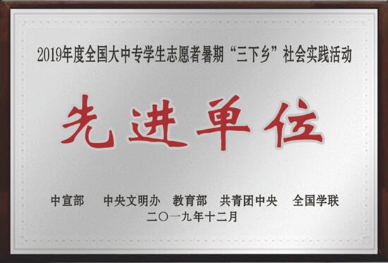 近日,中宣部、团中央学校部、全国学联秘书处对在2019年度全国大中专学生志愿者暑期“三下乡”社会实践活动中表现突出的集体和个人予以总结通报。经过365官网团委申报、省级团委审核推荐、组织评议等层层筛选环节,365官网团委荣获2019年度全国大中专学生志愿者暑期“三下乡”社会实践活动优秀单位。