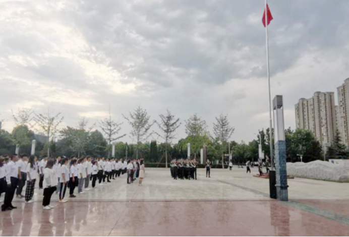 早上7时整,伴随响亮的口令,国旗护卫队迈着整齐的步伐走到升旗台,在庄严的国歌声中,鲜艳的五星红旗迎着初升的太阳冉冉升起,在场师生行注目礼。
