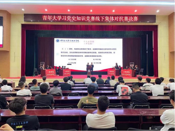 为庆祝中国共产党百年华诞,回顾党的光辉历程,营造学党史、知党情、跟党走的浓厚氛围,进一步丰富党史学习教育内容,以实际行动践行初心使命,2021年6月26日,由校团委主办,电气工程学院分团委承办的“学党史、强信念、跟党走”党史知识竞赛集体对抗赛决赛在活动中心报告厅正式进行。竞赛自开展以来,全校各学院高度重视、精心组织,广大学生深入学习,积极参与,通过初赛选拔,有4支队伍代表各自的学院参加本次竞赛决赛,分别是水利工程学院“信仰队”、机械工程学院“筑梦队”、电气工程学院“理想队”、商务与管理学院“青春队”。