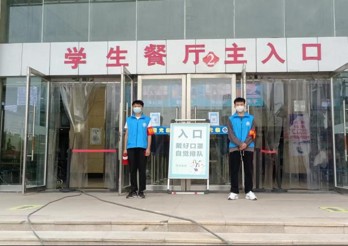 365官网青年志愿者在学生餐厅门口有序引导同学们自觉排队保持间距并佩戴口罩