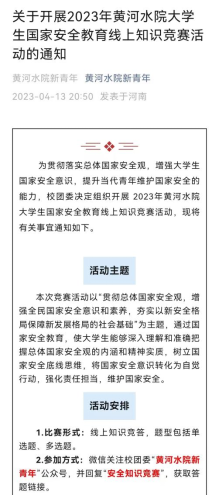 4月13日—20日,校团委在“黄河水院新青年”微信公众号上开展了国家安全教育线上知识竞赛,推动深入学习,促使知行合一,引导广大学生通过答题的方式牢固树立总体国家安全观、感悟新时代国家安全成就,积极响应国家安全教育号召。