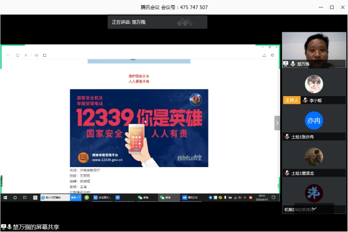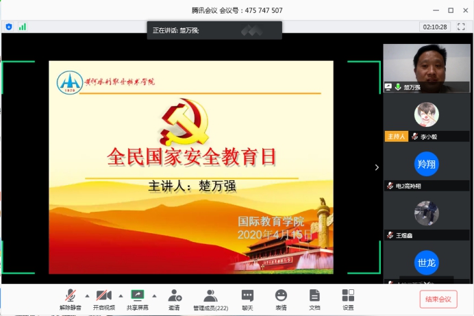 4月15日晚上,国际教育学院在线上开展了“全民国家安全教育日”主题教育活动,学院党总支书记楚万强出席,辅导员李小毅及全体2019级中俄合作办学专业学生参加,活动由楚万强主持。