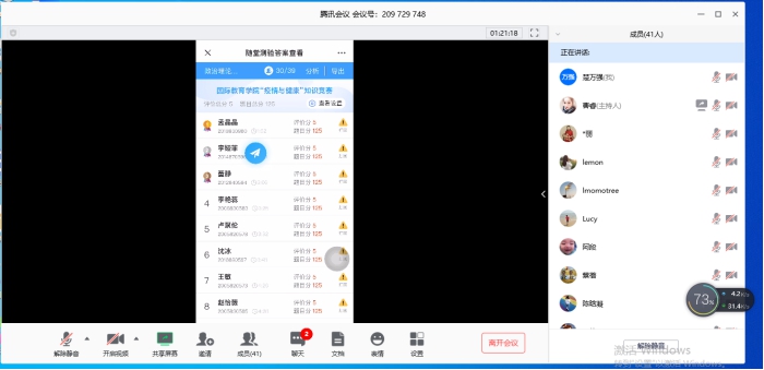 经过两周时间的充分准备,3月24日下午,学院在线上通过腾讯会议直播和智能课堂平台,开展了“防疫与健康”专题知识答题竞赛活动。学院全体教职工参加,活动由院党总支办公室主任曹睿主持开展。在竞赛活动中,全体教师在智能课堂平台上认真答题,优秀率高,以赛促学,以学促行,强化了自身疫情防控知识和意识,达到了预期效果。在本次竞赛中,共推选出孟晶晶、黄海燕、李小毅三位教师作为学院代表参加学校决赛。
