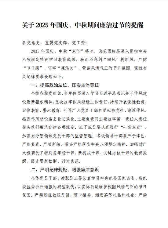 【廉洁提醒】关于 2025 年国庆、中秋期间廉洁过节的提醒