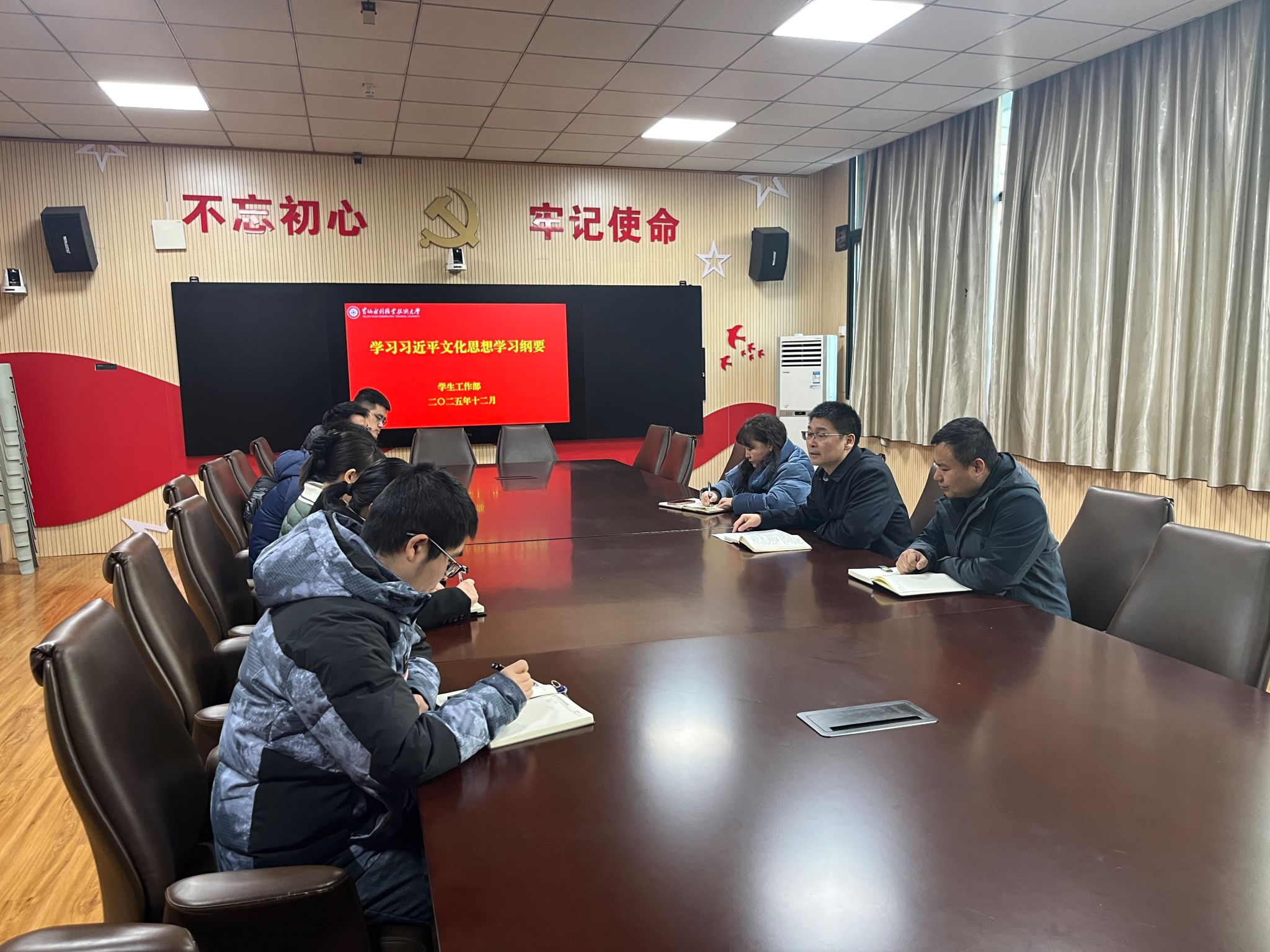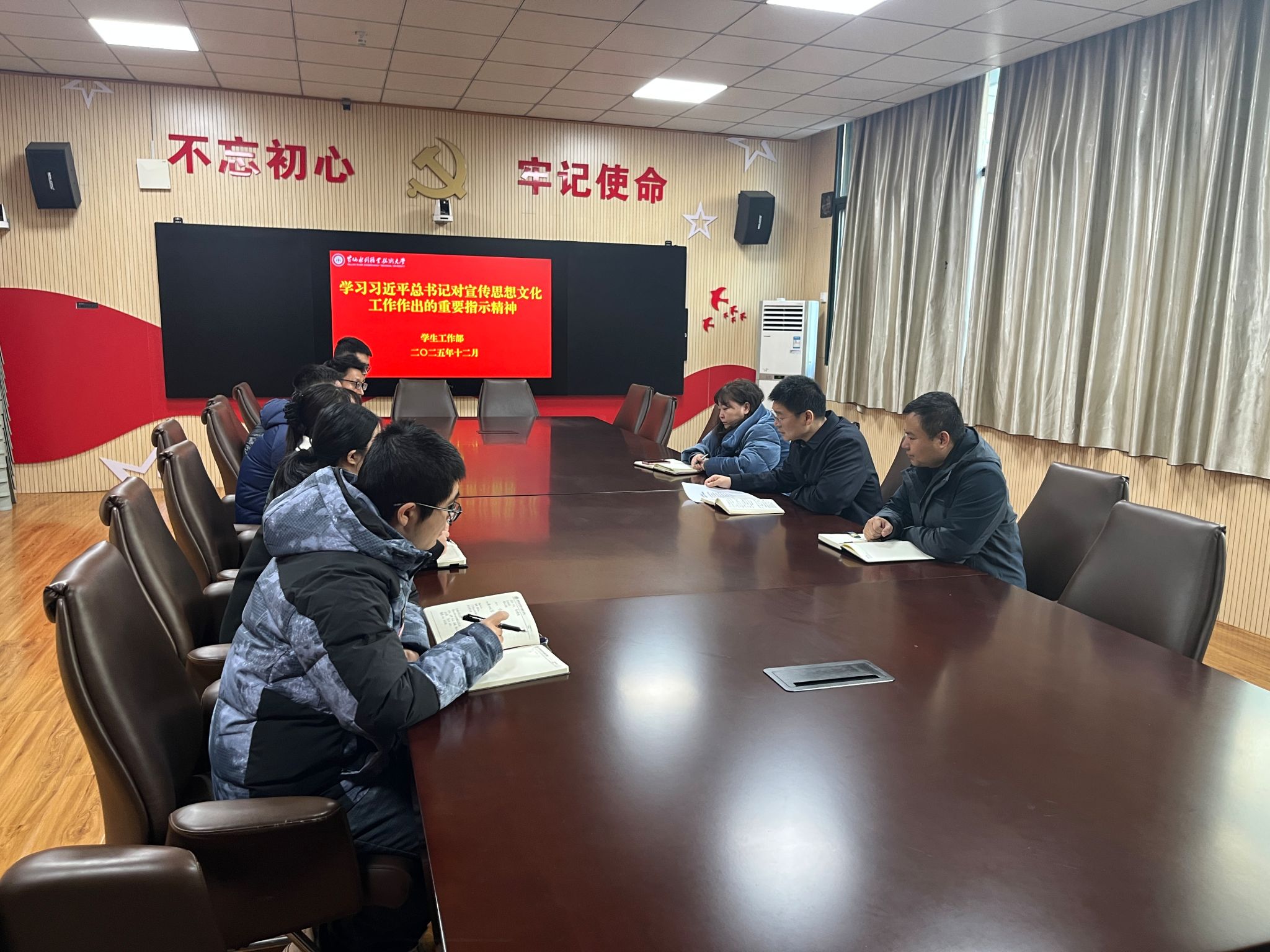 12月30日,为深入贯彻落实重要精神、筑牢思想文化根基,学生工作部召开2025年下半年第八次政治理论学习专题会。此次会议聚焦习近平总书记对宣传思想文化工作作出的重要指示、习近平总书记在文化传承发展座谈会上的讲话以及《习近平文化思想学习纲要》展开深入学习研讨。会议由学生工作部部长商坤主持,部门全体成员参加,旨在深刻领会精神内涵,推动学生工作与文化传承创新深度融合,在新时代文化建设浪潮中展现新担当、新作为。