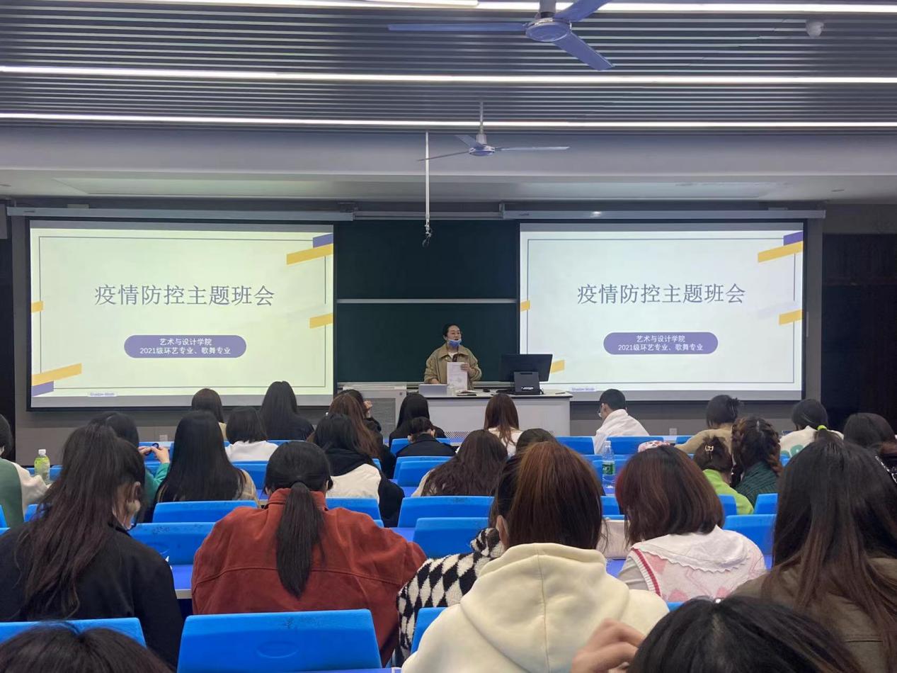 2022年3月15日晚,艺术与设计学院在JX2102开展了疫情防控主题班会,辅导员高蕊和2021级同学参加会议。