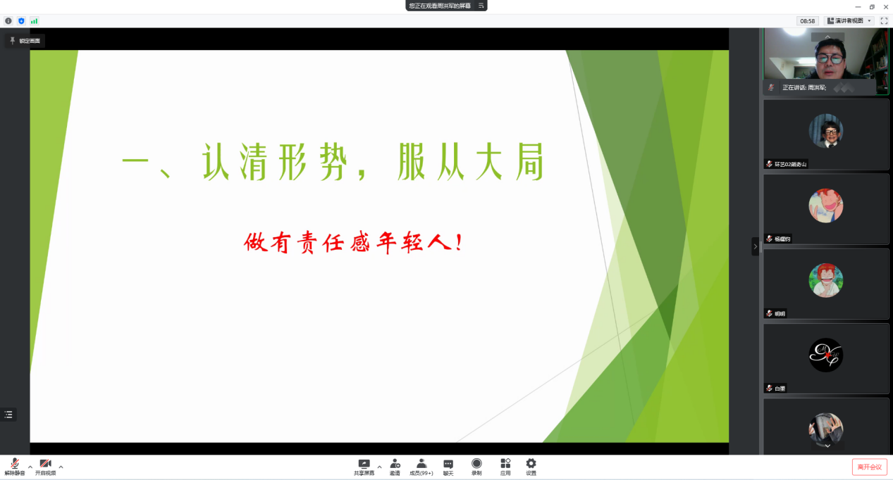 近期国内疫情形势严峻,全国上下全力抗击疫情。为增强学生自我防护意识,构建大安全格局,根据学校疫情防控最新要求,2022年3月16日晚,艺术与设计学院2020级辅导员周洪军,组织20级全体学生召开“步调一致才能得胜利”为主题的疫情防控专题年级班会。