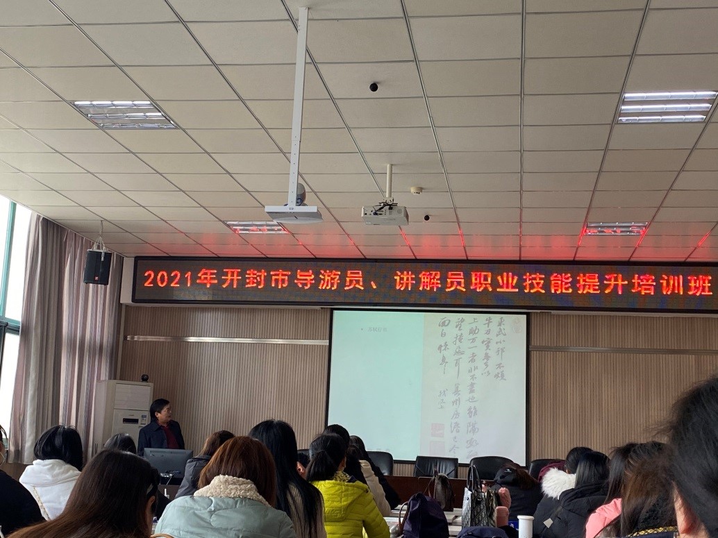 3月19日,应365官网旅游学院邀请,我院周洪军副教授为开封市导游从业人员职业技能培训班(第1期)授课。周教授的《开封书法与书法鉴赏》课程,从文化积淀——开封书法的发展根基、历史名人——开启开封书法大局、书家云集——开封近现代的书法高峰等三个方面,深入阐述了开封文化的厚重历史和书法艺术的辉煌成就;并图文并茂,系统讲解了书法鉴赏的专业知识。周教授丰厚的学养和对开封厚重历史的热爱与深情,深深感染了每一个学员。三个小时的课程授课学员热情饱满,互动热烈,获得良好教学效果。