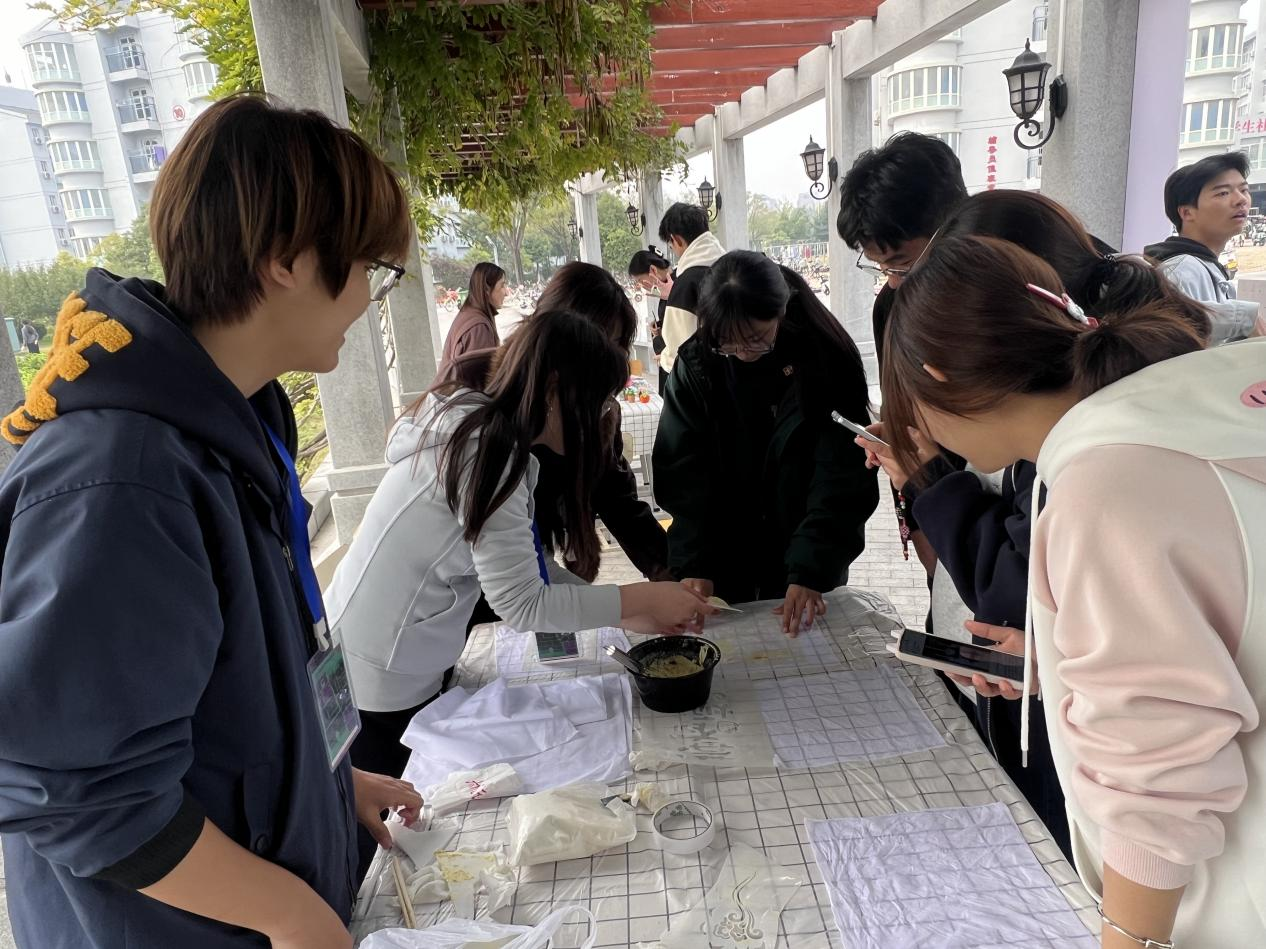 活动期间,扬帆广场上20余个摊位错落排布,扎染的靛蓝、年画的正红、漆扇的雅致交织成一幅流动的民俗画卷,现场人潮涌动,欢声笑语不断。本次市集以“可学、可玩、可感”为核心,设置“非物质文化遗产技艺体验区”“创意产品展示售卖区”“学生非物质文化遗产作品展区”三大板块,让师生体验中华优秀传统文化的技艺,在动手实践中读懂传统文化的内涵。