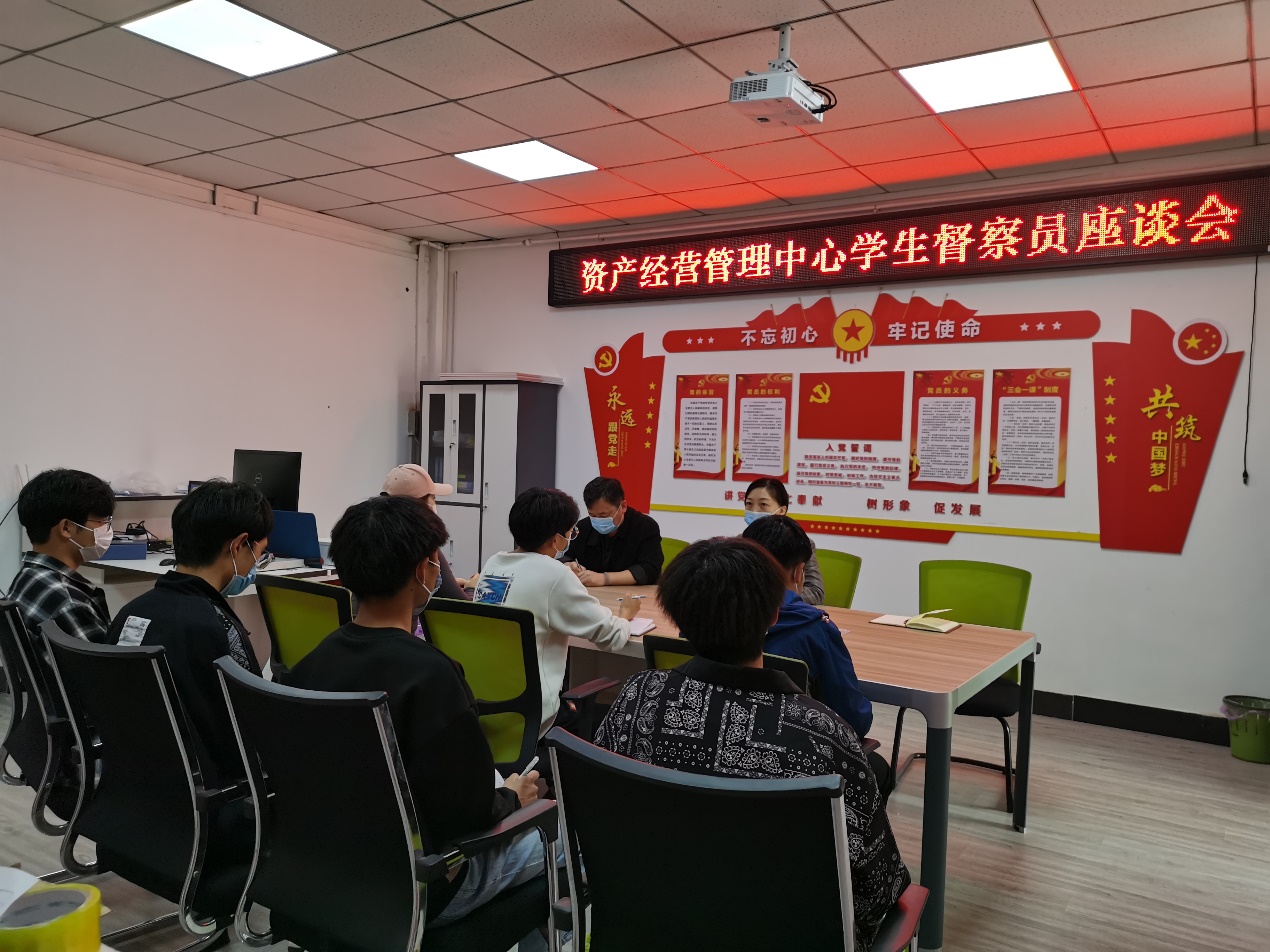 为加强校园生活服务中心监督管理和做好具体考核工作,进一步推动能力作风建设活动走深走实,5月11日,资产经营管理中心党总支召开学生督察员座谈会。会议由资产经营管理中心党总支书记鄢彬彬主持,生活服务中心负责人曾庆永、学生会维权部学生督察员代表参会。