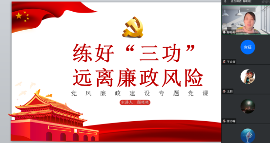 12月13日下午,资产经营管理中心党总支书记鄢彬彬上了一堂以《练好“三功”远离廉政风险》为题为题的廉政党课。全体党员通过线上参加了本次学习。
