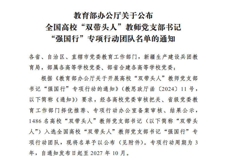 据悉,此次高校“双带头人”教师党支部书记“强国行”专项行动,经基层党组织申报、学校党委审核把关、省级党委教育工作部门择优推荐、专项行动办公室备案审核,共遴选产生1486个高校“双带头人”教师党支部书记“强国行”专项行动团队,旨在创新落实立德树人根本任务,深入贯彻落实教育部党组关于高校“双带头人”教师党支部书记培育工作的部署要求,引导广大师生在以中国式现代化全面推进强国建设、民族复兴伟业新征程上砥砺新担当、展现新作为。