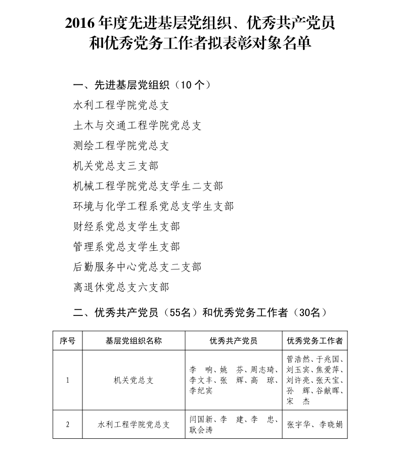 2016年度先进基层党组织、优秀共产党员给和优秀党务工作者拟表彰对象名单